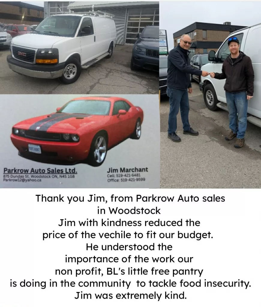 We are incredibly grateful to Jim Marchant from Parkrow Auto Sales in Woodstock for his kindness and support. Jim generously reduced the price of our new vehicle to fit our budget, showing he truly understands the importance of our mission to tackle food insecurity. Thanks to this support, BL’s Little Free Pantry is now better equipped to serve our community!