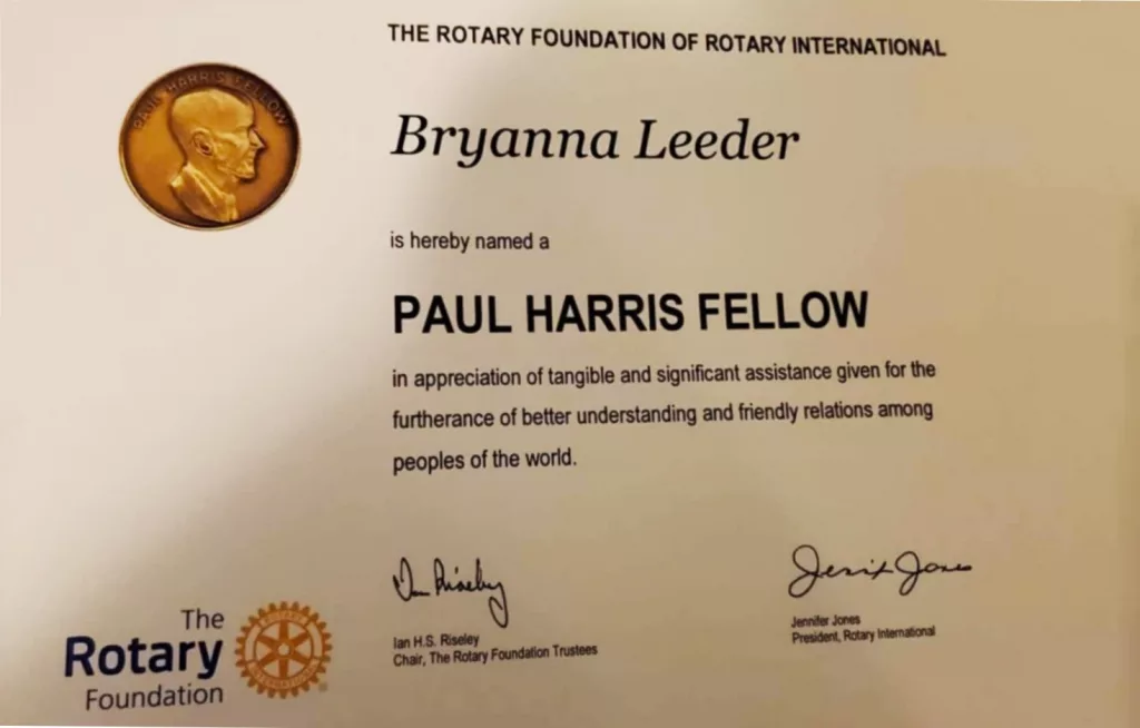 The Paul Harris Fellow Program was established by Rotary International in 1957 to show appreciation and recognize individuals who contribute, or have contributions made in their name, of $1,000 to the Rotary Foundation.
