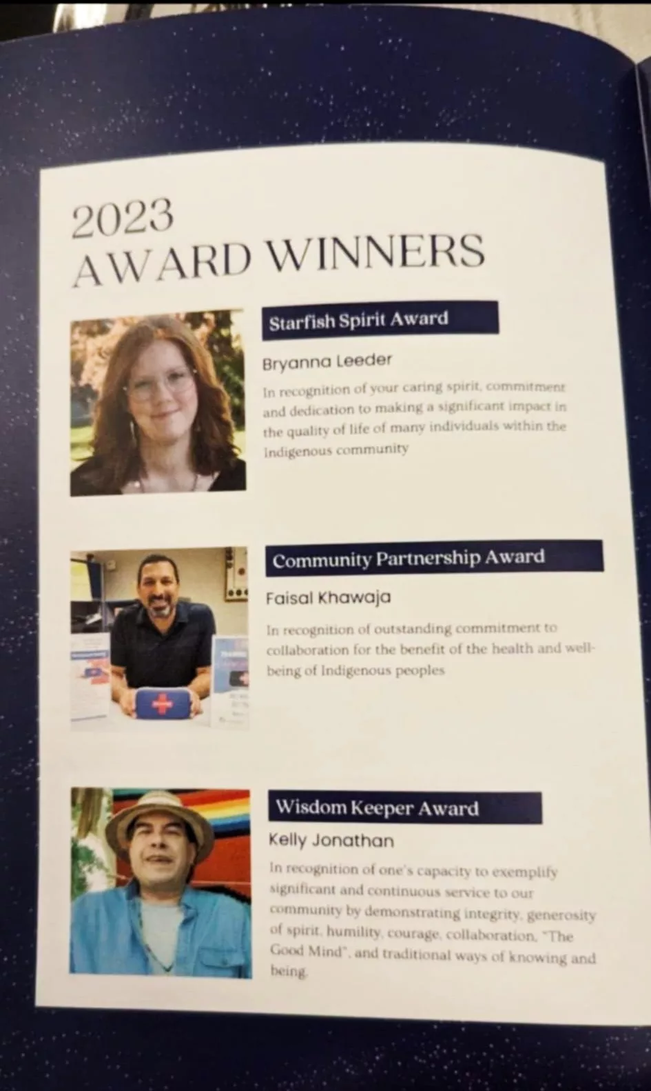 Created in 2015, this award recognizes the caring spirit, commitment, and dedication to making a significant impact on the quality of life of many individuals within the Indigenous Community. It is awarded annually to an individual who has demonstrated the above values in their everyday life and work for the people.
